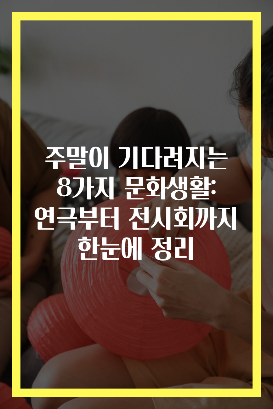 메타 설명: 주말에 즐길 수 있는 8가지 문화생활을 소개합니다. 연극, 전시회 등 다양한 예술 활동으로 풍성한 주말을 만들어보세요.